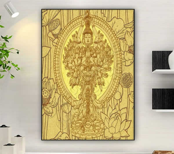 <div style="text-align: justify;">Hình ảnh Quan Thế Âm Bồ Tát với gương mặt phúc hậu từ bi, tay phải cầm cành dương liễu, tay trái cầm bình cam lồ, trên tòa hoa sen là hình ảnh cứu nạn chúng sinh.</div>